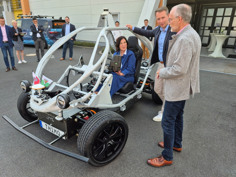 Wie – und wann – kann durch Forschung an Sensorik, Automatisierung und Datenanalytik und darauf basierenden Anwendungen wie dem automatisierten und vernetzten Fahren Wertschöpfung für die Thüringer Wirtschaft generiert werden? Diese Frage stand im Mittelpunkt des Besuchs der Thüringer Ministerin für Wirtschaft, Landwirtschaft und ländlichen Raum, Colette Boos-John, am 6. August am Thüringer Innovationszentrum Mobilität (ThIMo) an der TU Ilmenau. Sie wurde begleitet durch Andreas Bühl, Mitglied des Thüringer Landtags und u.a. Vorsitzender des ÖPNV-Ausschusses im Ilm-Kreis. Im Austausch mit dem Leiter des ThIMo, Prof. Matthias Hein, weiteren Wissenschaftlern und der Universitätsleitung sowie dem Ilmenauer Oberbürgermeister Dr. Daniel Schultheiß und dem Landesvorsitzenden der Wirtschaftsjunioren ThüringenNam Gutzeitverschaffte sich die Ministerin im Rahmen ihrer Möglichmachertour 2025 einen Überblick über das, was Thüringen heute schon stark macht und künftig noch stärker machen könnte.
